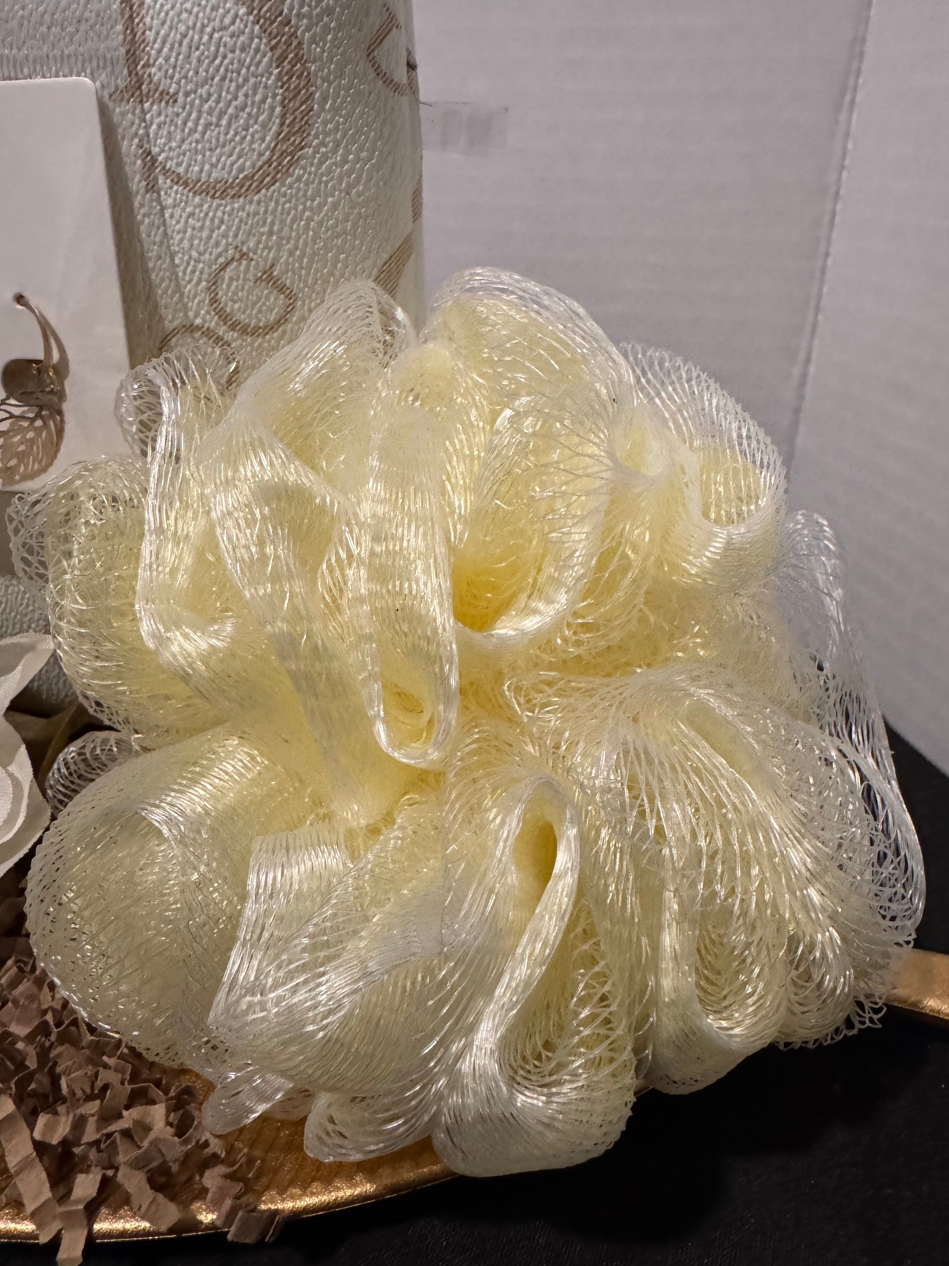 • Fluffy Bath Pouf/Loofah: A soft, yellow mesh pouf to enhance your lather and gently exfoliate your skin in the shower or bath.