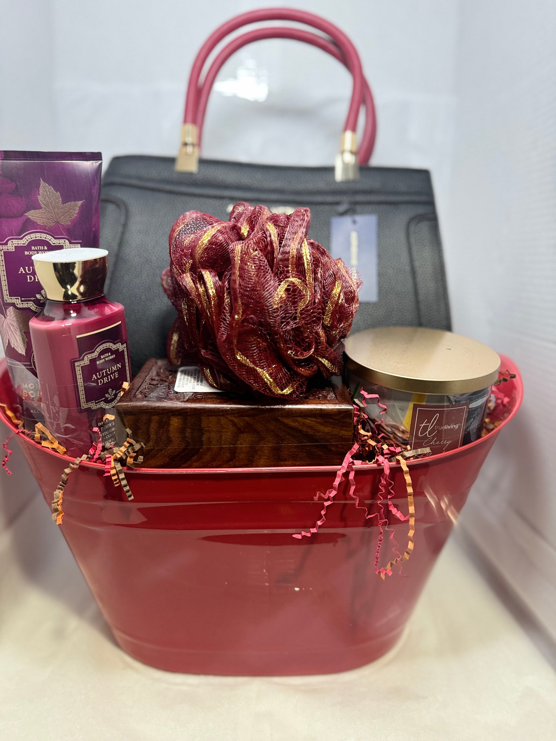 Treat someone special (or yourself!) to the "Autumn Drive" Luxury Self-Care Basket, a curated collection designed for relaxation, style, and cozy indulgence. Presented in a chic, reusable metallic ruby-red tub and nestled with festive shredded filler, this basket is the perfect gift for birthdays, holidays, or just because.