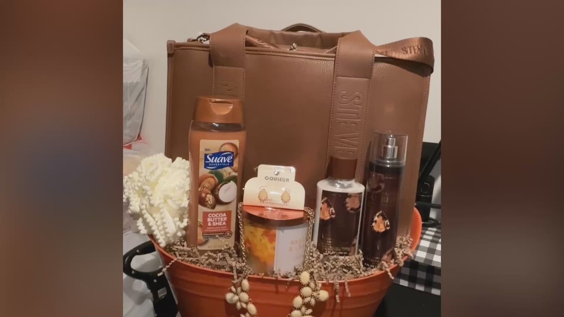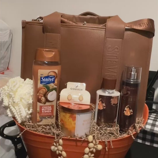 This stunning gift basket curated by Steve Madden is sure to delight! Featuring a large Steve Madden tote, Suave cocoa butter and shea essentials, BBW chocolate amber body spray and lotion, a cozy maple & chai candle, a stylish creme necklace, luxurious loofah, soothing silk eye mask, and a prayer flipbook, all presented in a sleek orange storage tub. A $185 value, yours for only $125!